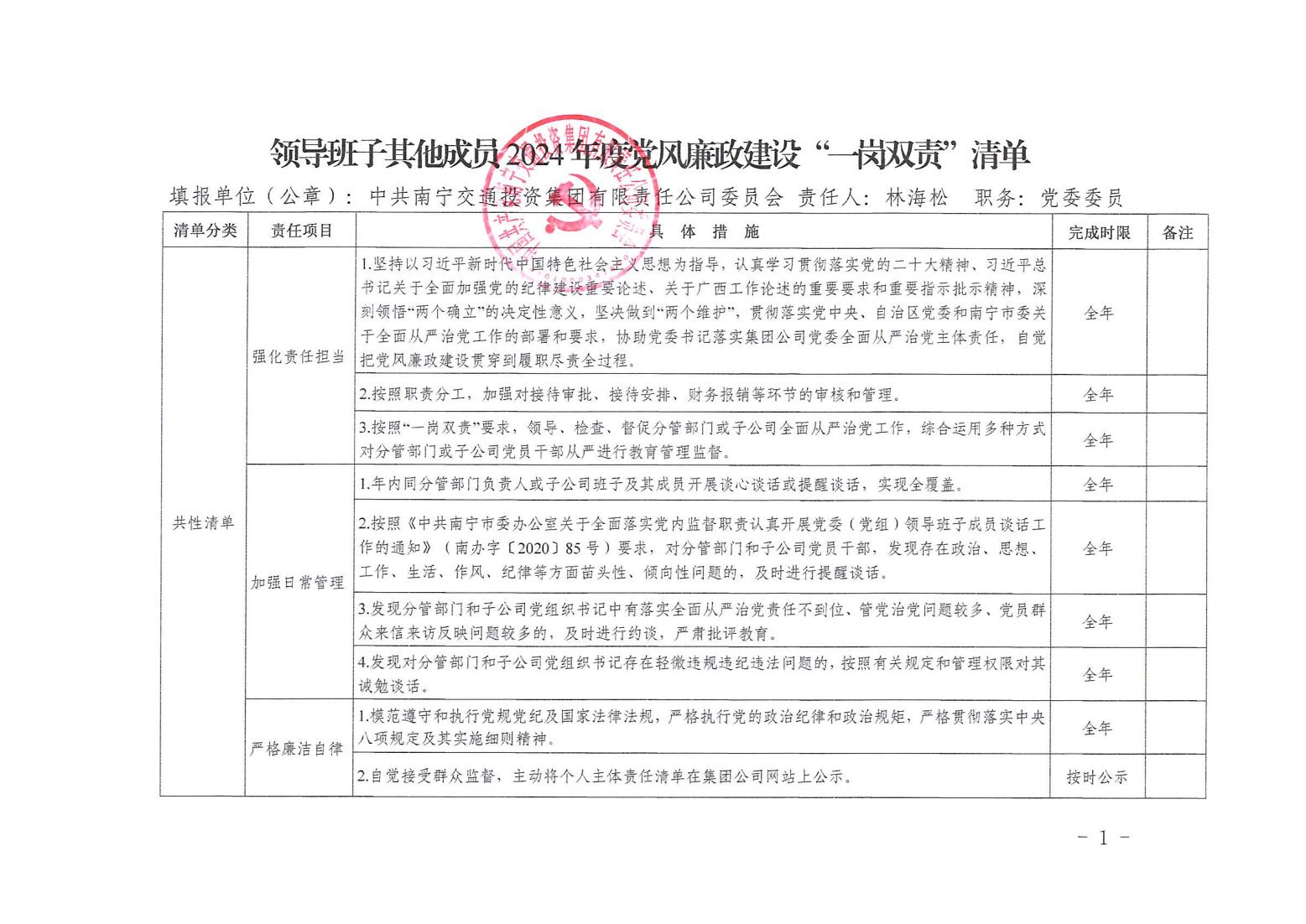 領(lǐng)導班子其他成員2024年度黨風廉政建設(shè)“一崗雙責”清單(二)