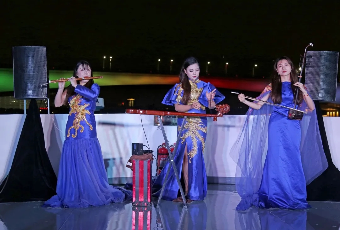 微風拂面,夜景怡人,滿載游客的3艘邕江游船來回穿梭在邕江之上,沿江兩岸燈光絢麗多彩,跨江大橋恢弘大氣,民樂表演風情十足,乘船游客紛紛拿出手機、相機合影留念。