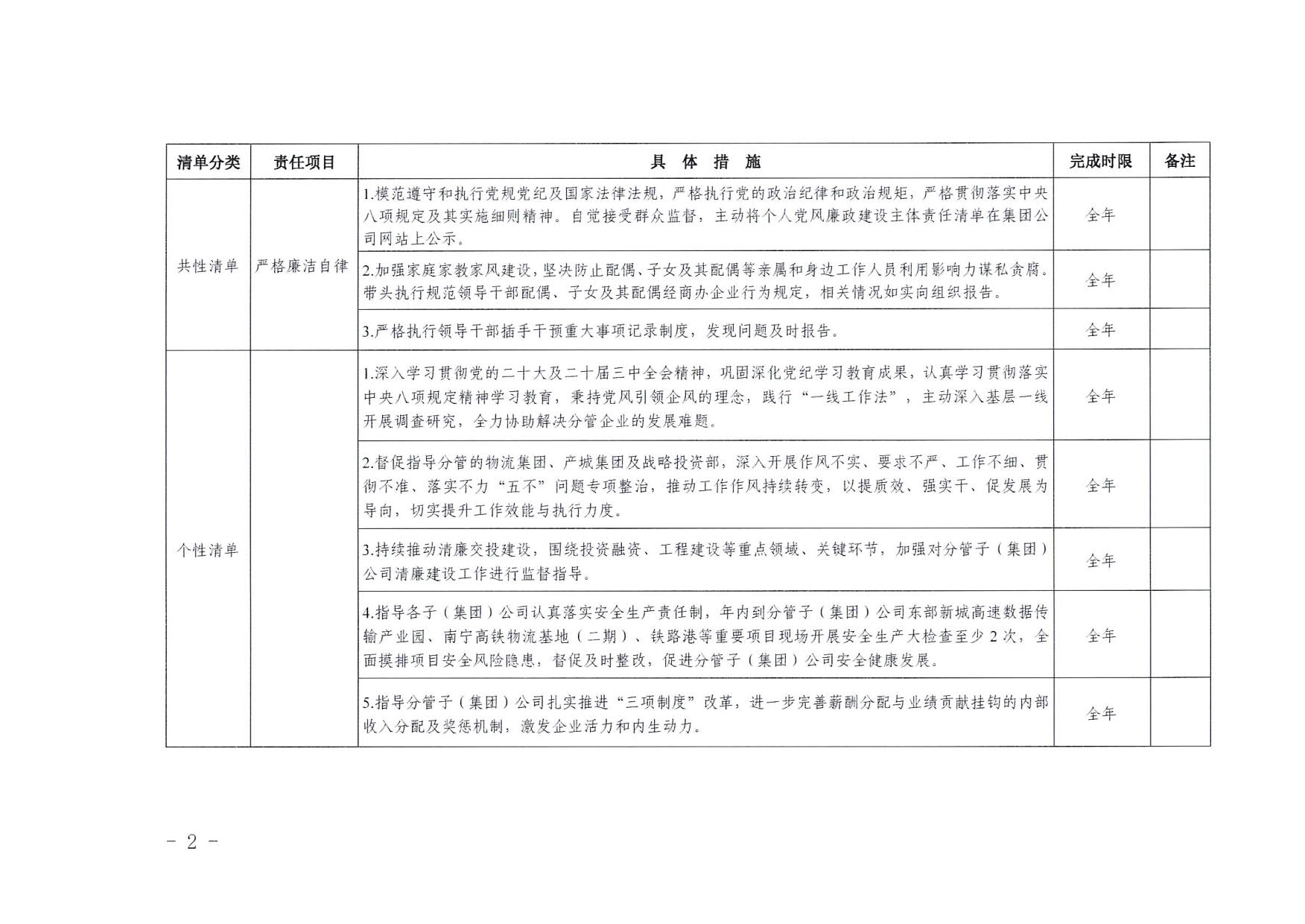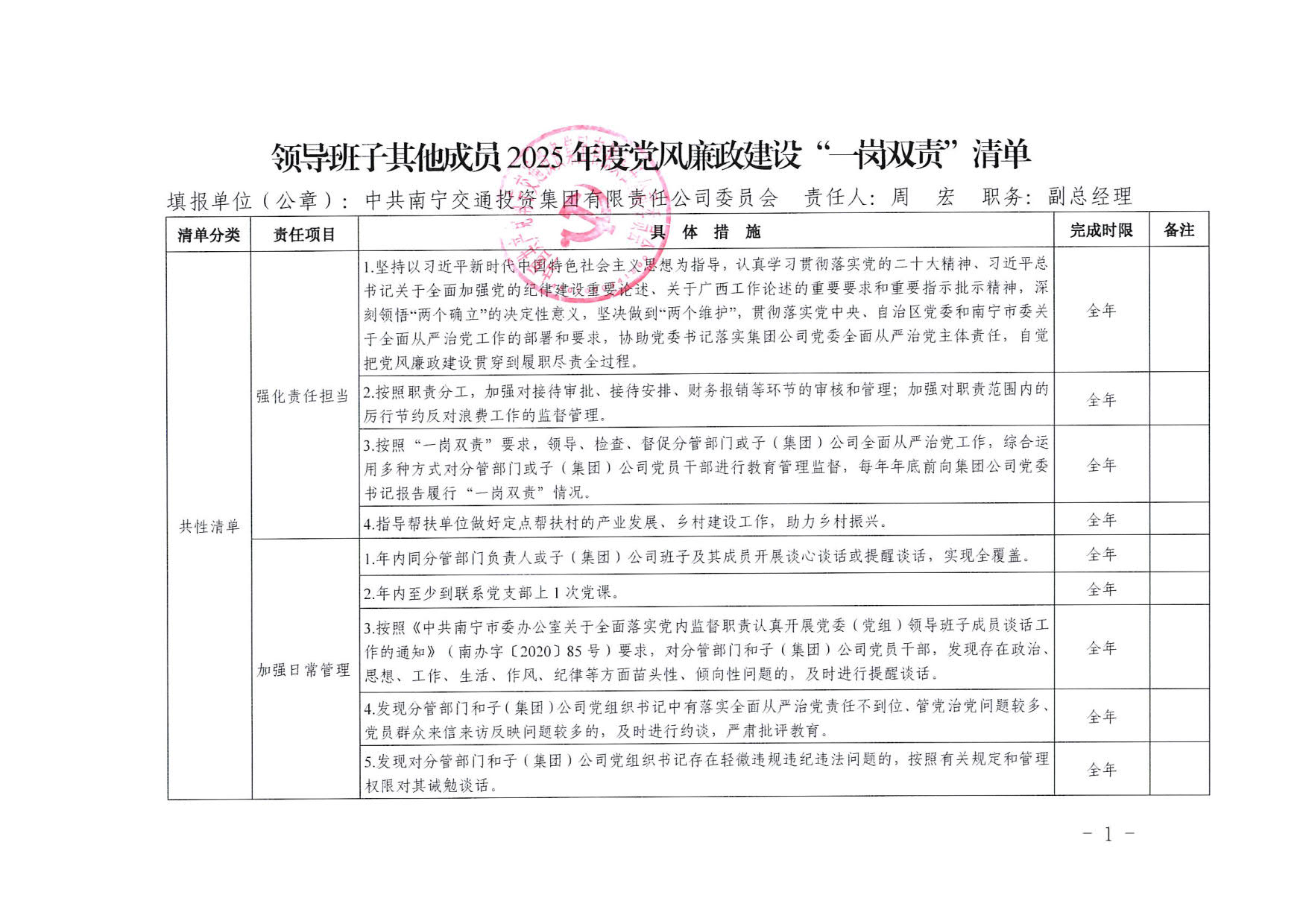 南寧交投集團領(lǐng)導班子其他成員2025年度黨風廉政建設(shè)“一崗雙責”清單(五)