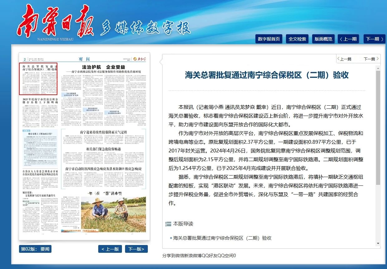 海關(guān)總署批復通過南寧綜合保稅區(qū)(二期)驗收